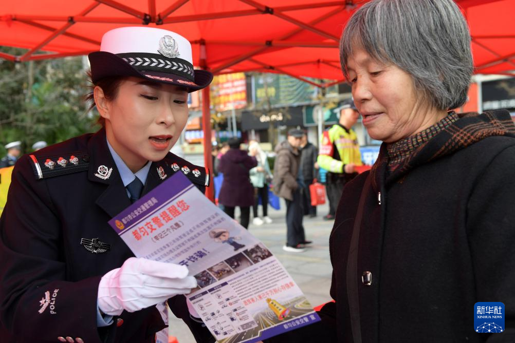 1月10日,一名交通民警在贵州省黔南布依族苗族自治州都匀市人民广场向市民普及交通安全知识。