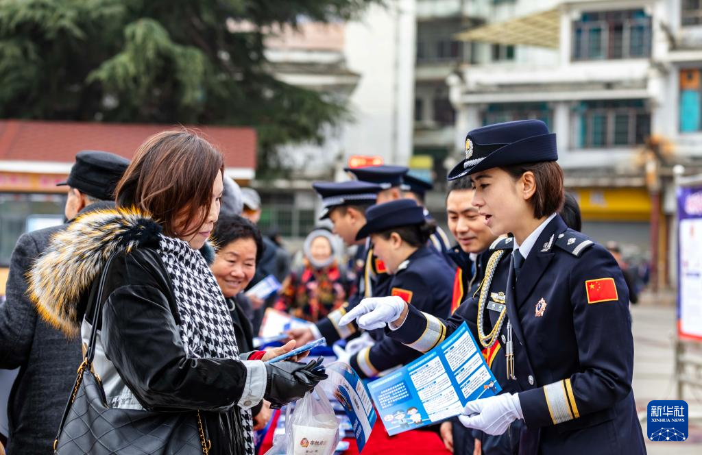 1月10日,在贵州省赤水市仁和广场,民警向市民宣传法律法规知识。