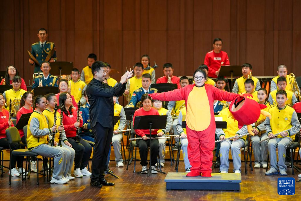 2024年1月6日,在重庆市特殊教育中心的扬帆音乐厅,扬帆管乐团成员(右)在彩排新年音乐会节目,老师通过拍打肩膀向她传递指挥的手势。