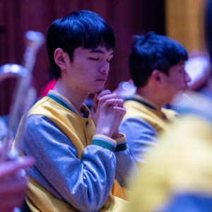 1月6日,在重庆市特殊教育中心的扬帆音乐厅,扬帆管乐团成员王太樊在听合唱《如愿》时许愿。