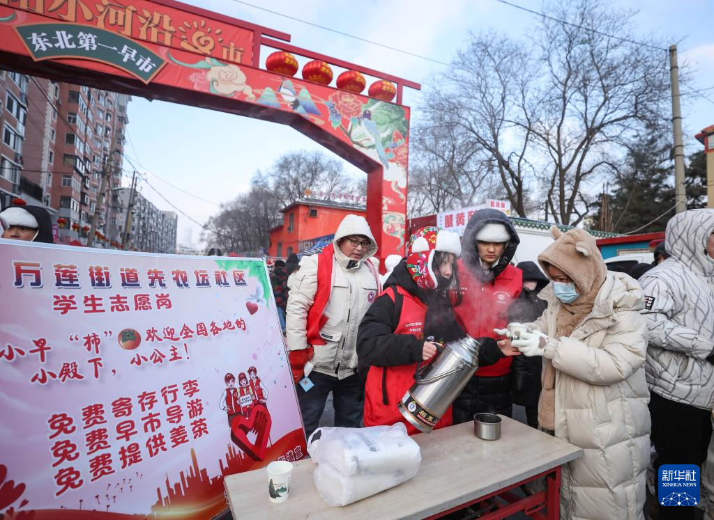 1月21日,在沈阳小河沿早市,志愿者为游客提供免费热水。