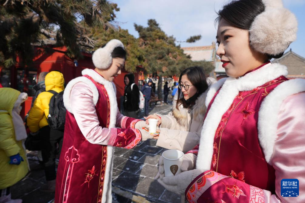 1月21日,沈阳故宫的工作人员为游客提供姜糖水和暖贴。