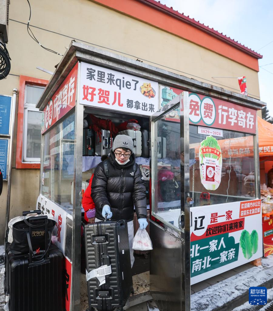 1月21日,游客在沈阳小河沿早市的行李寄存处取行李。