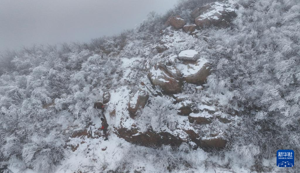 1月18日,在山东省潍坊市临朐县国有沂山林场,护林员蔡长春站在金山顶瞭望哨向外瞭望(无人机照片)。
