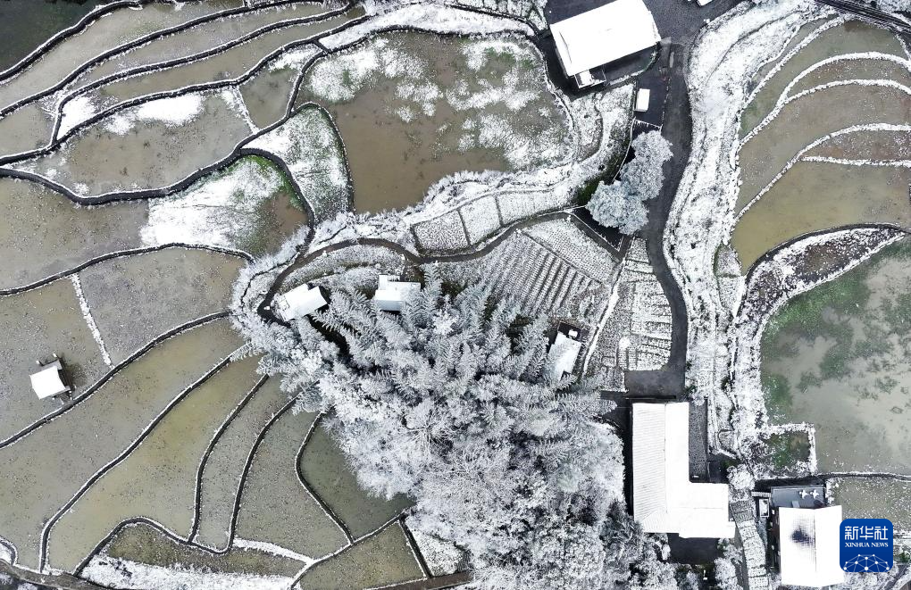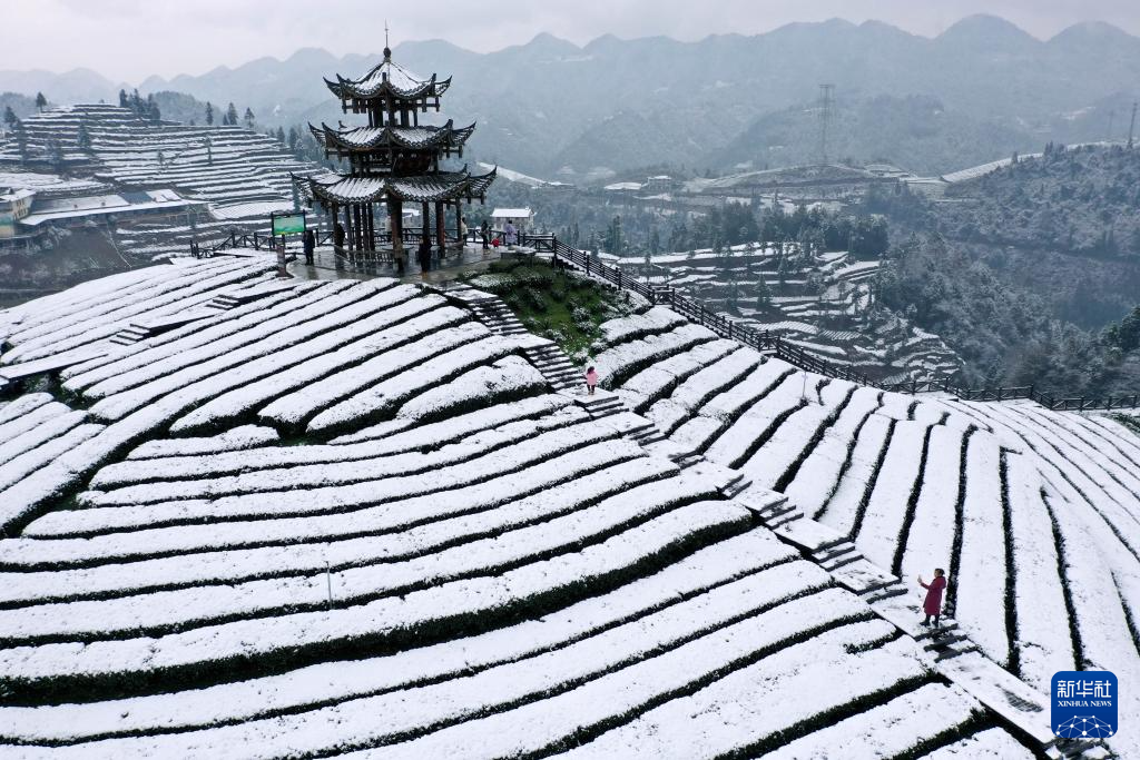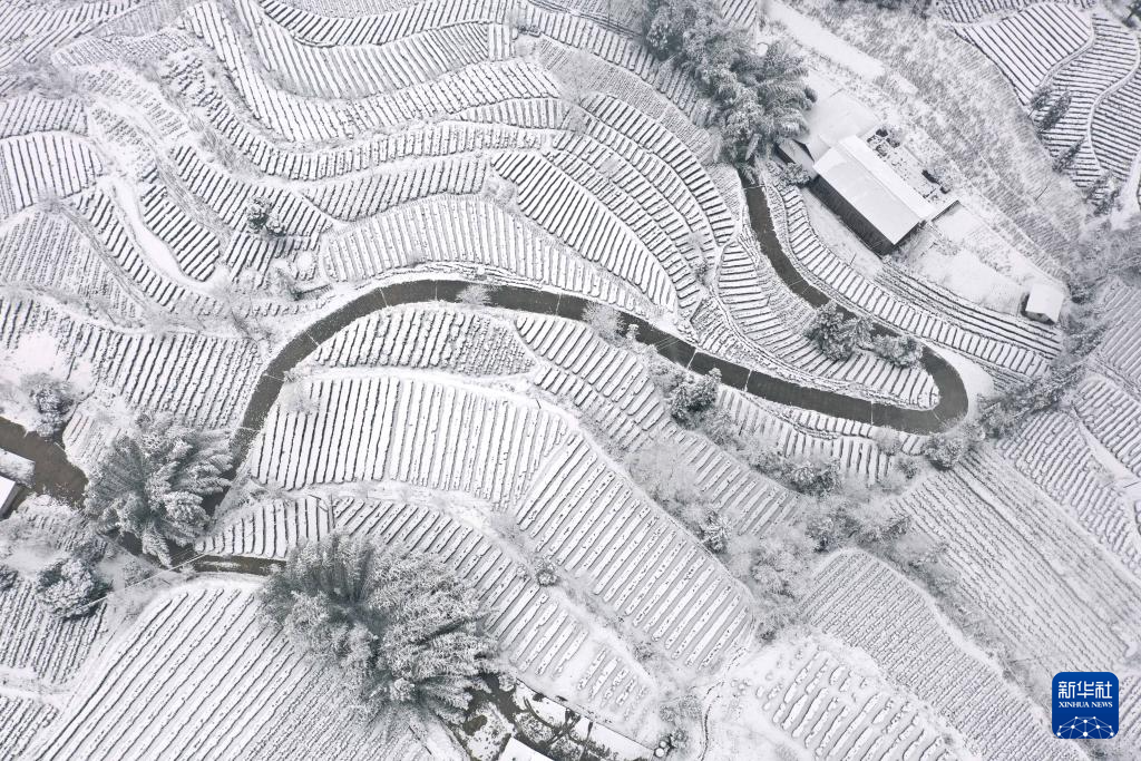 1月22日,湖北省宣恩县境内的茶园梯田被白雪覆盖(无人机照片)。