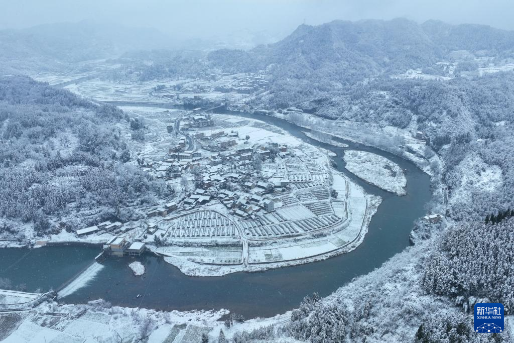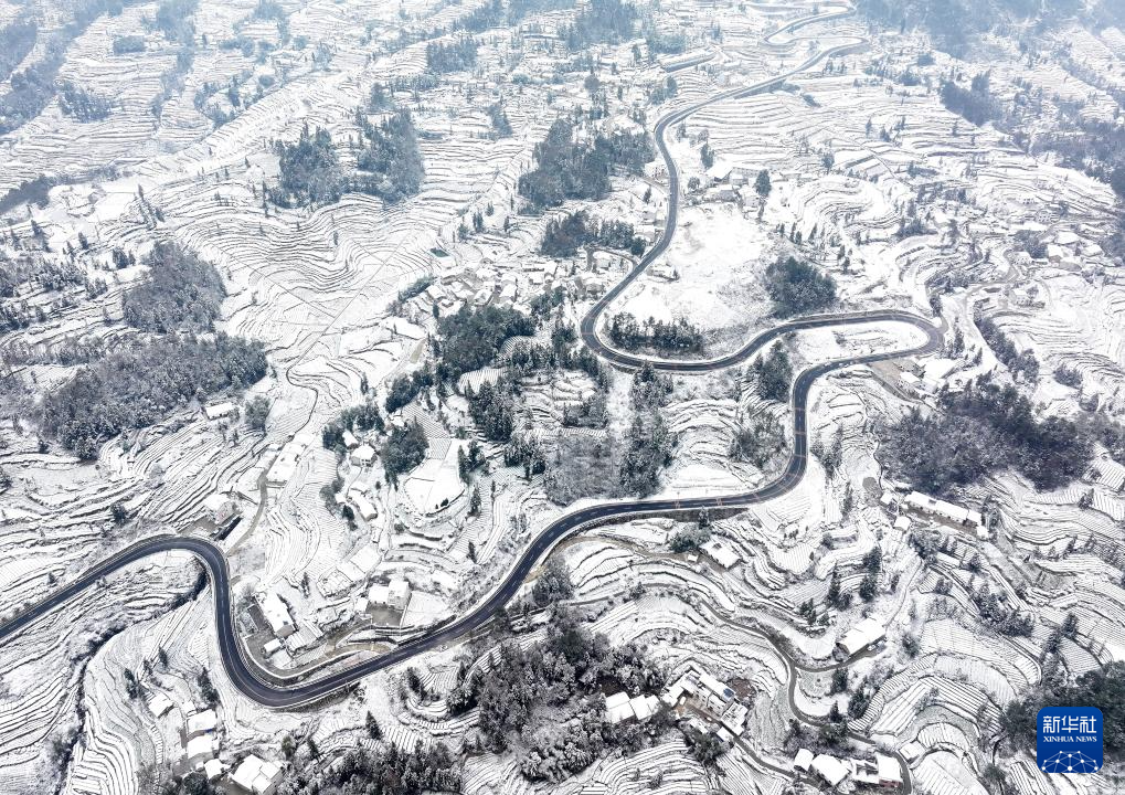 1月22日在湖北省宜昌市秭归县茅坪镇拍摄的雪后乡村及盘山公路(无人机照片)。