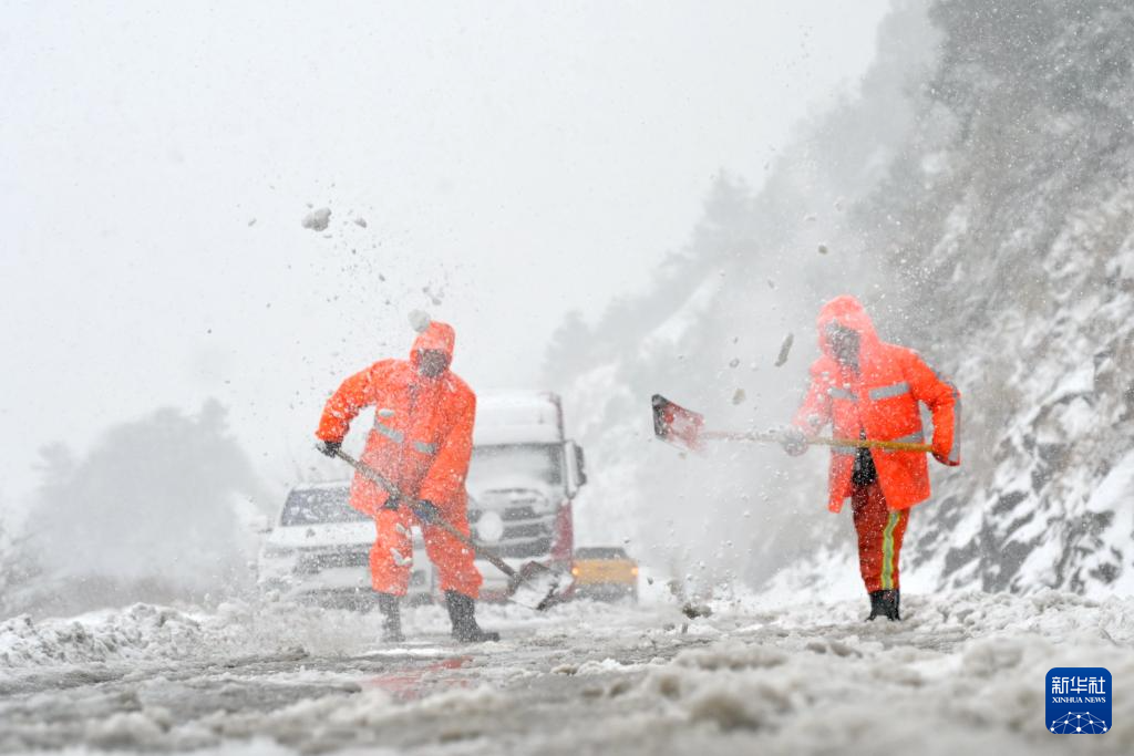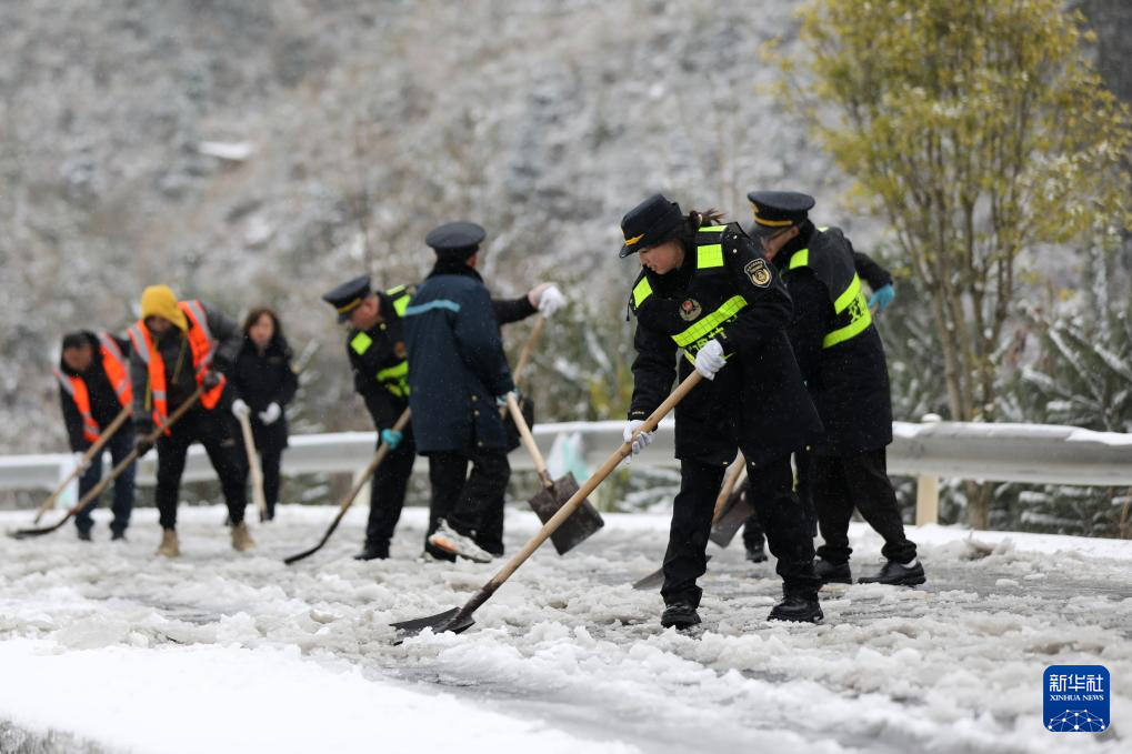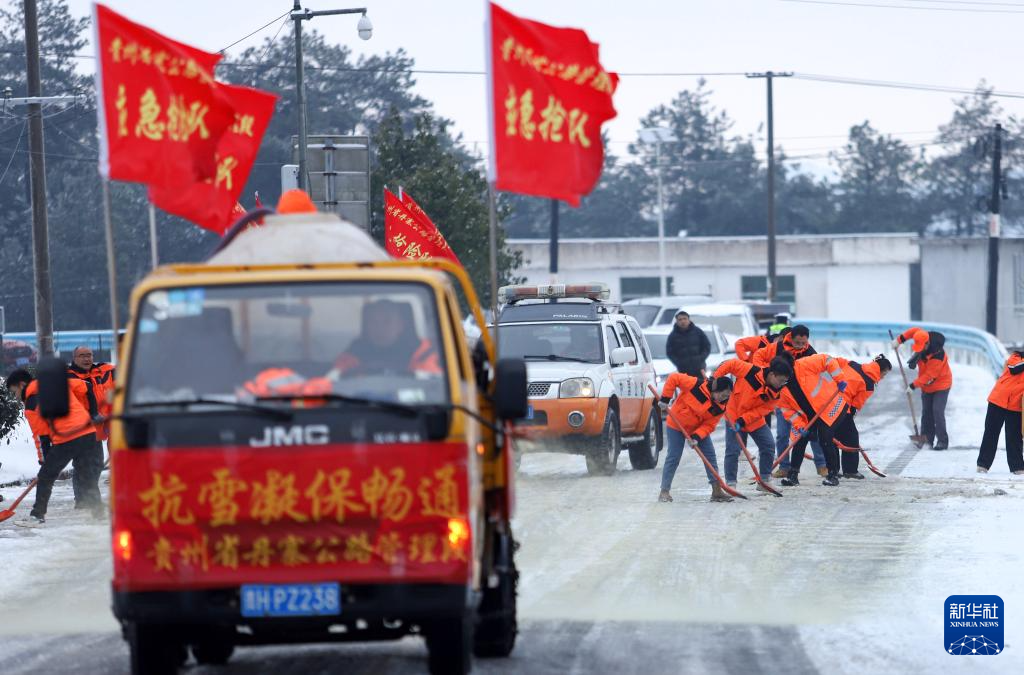 1月22日,人们在贵州省黔东南苗族侗族自治州锦屏县大同乡境内公路上清除积雪。