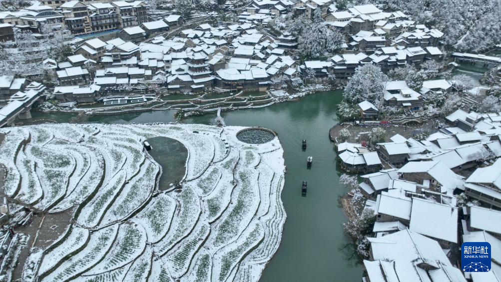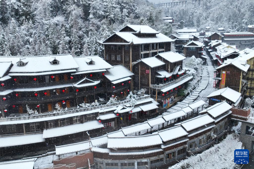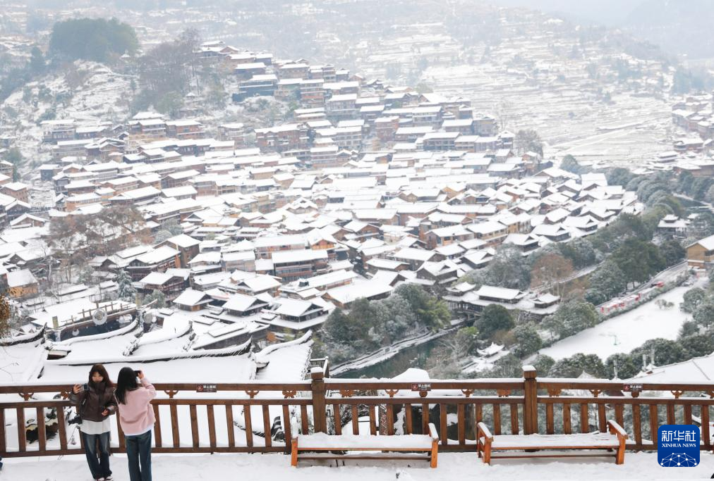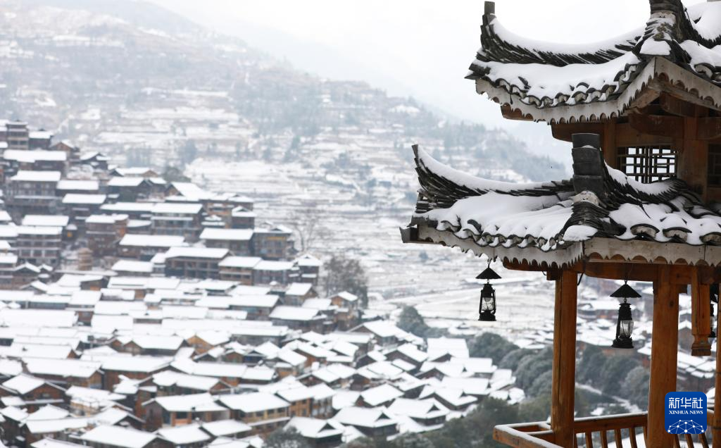 1月22日拍摄的贵州省黔东南苗族侗族自治州雷山县西江千户苗寨景区雪景。