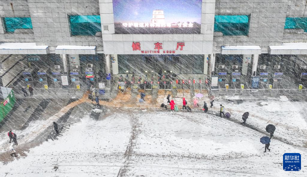 1月22日,江西南昌站工作人员在西广场为旅客铺设进站通道(无人机照片)。