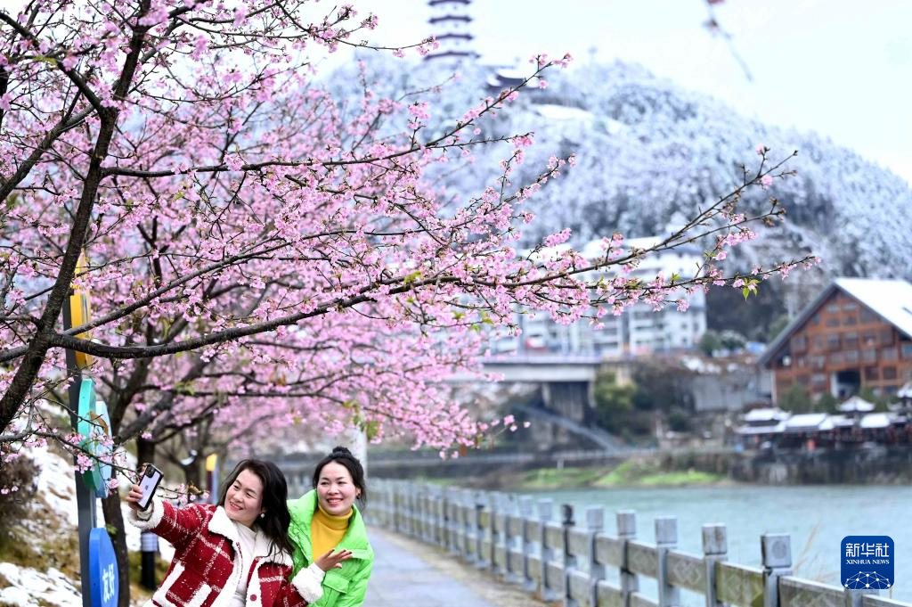 1月22日,市民在贵州省黔东南苗族侗族自治州锦屏县健康步道上赏花拍照。