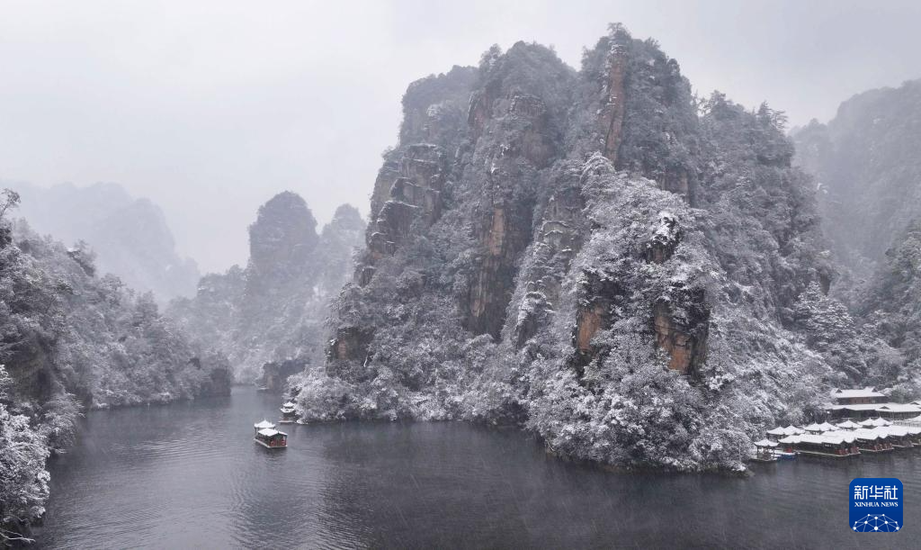 1月22日,游人在张家界市武陵源宝峰湖景区赏雪游玩。