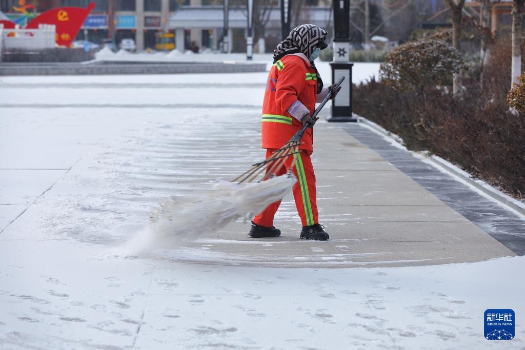 1月21日,环卫工人在甘肃省定西市安定区清扫积雪。