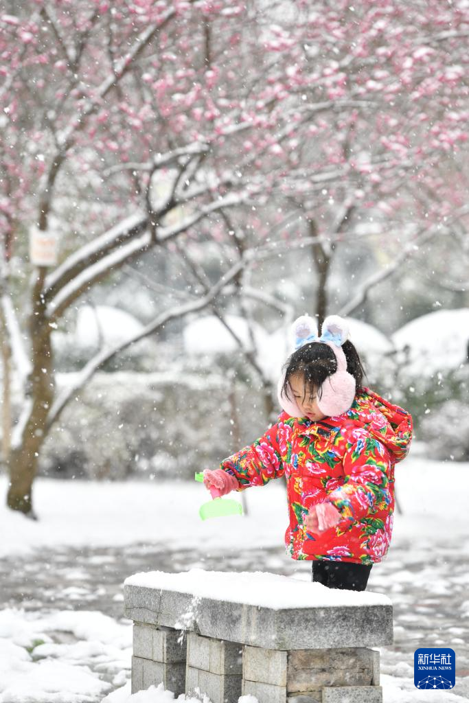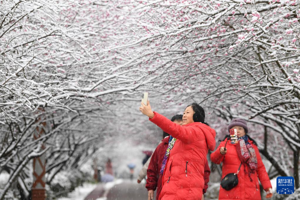 1月22日,在贵州省遵义市余庆县都市第三地生态园,市民在欣赏雪中梅花。