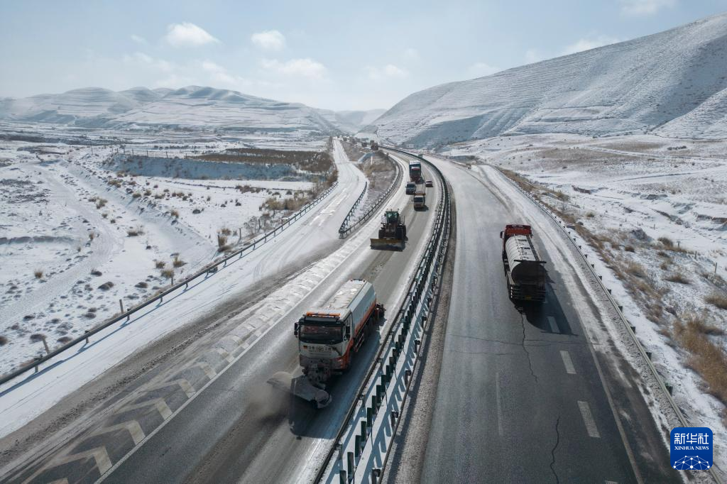 1月21日,甘肃省武威公路事业发展中心除雪车在G2012定武高速营双段开展除雪作业(无人机照片)。