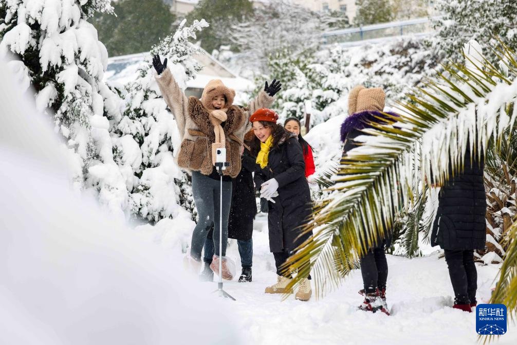 1月22日,贵州省黔东南苗族侗族自治州三穗县迎来今年首场降雪,市民在县城广场赏雪拍照。