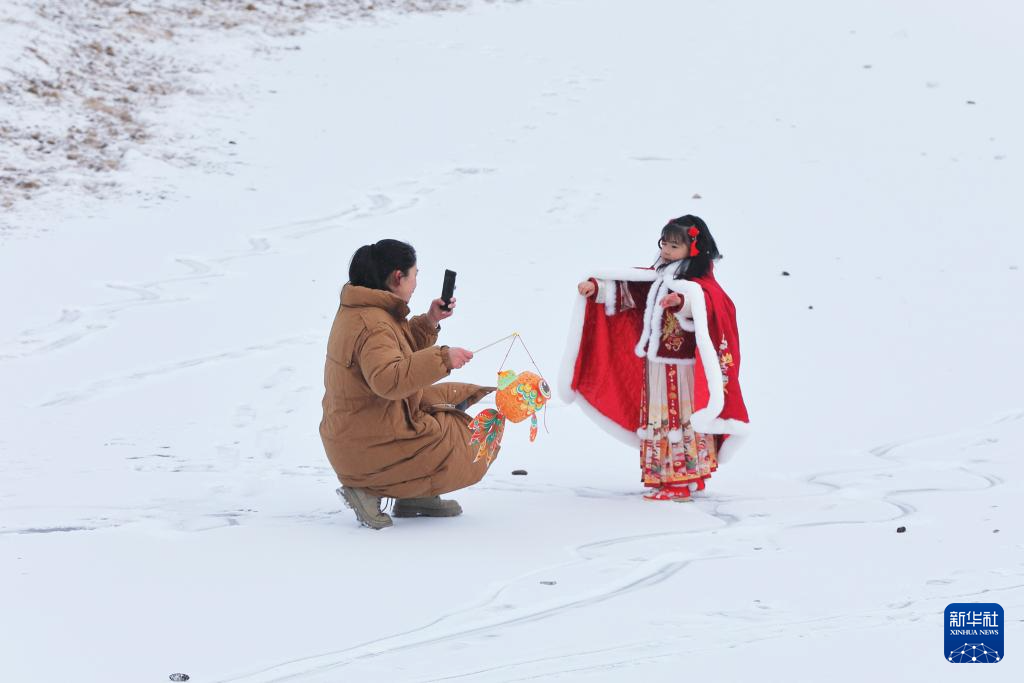 1月21日,市民在甘肃省定西市安定区定西湖公园拍照游玩。