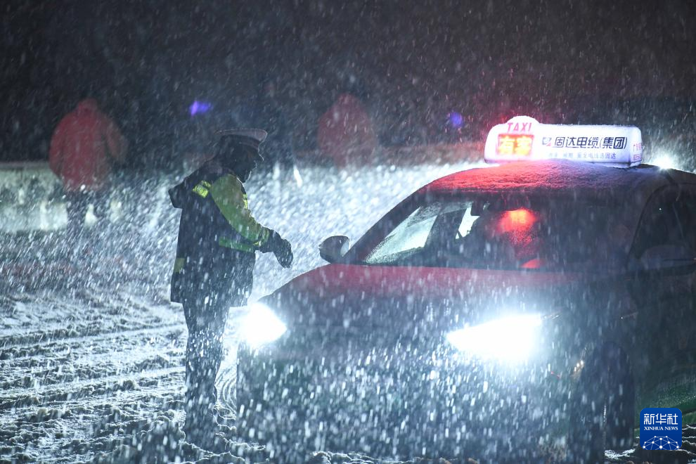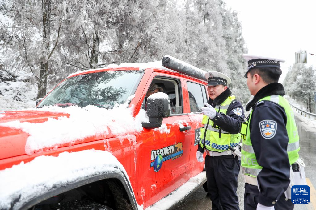 1月22日,四川省广安华蓥市交警在积雪结冰路段严检细查车辆安全情况。
