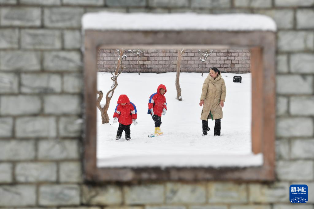 1月22日,家长带领小朋友在贵州省黔东南苗族侗族自治州黄平县行政中心广场玩雪。