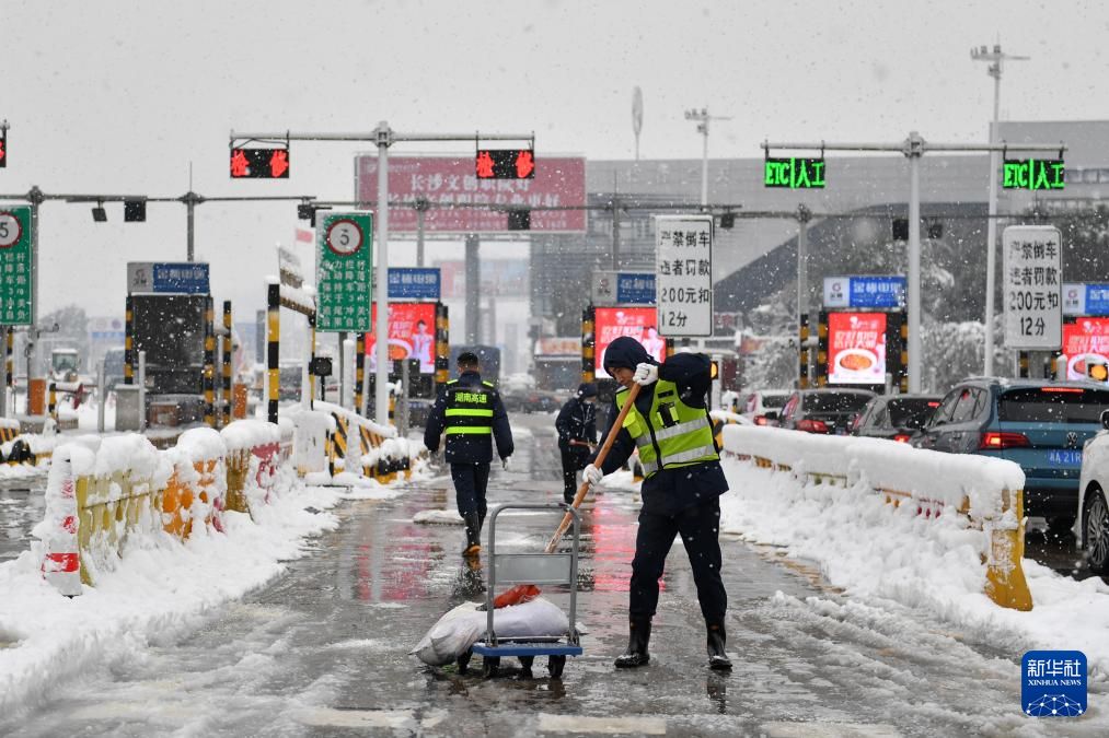 1月22日,在湖南省长沙市,工作人员在长张高速长沙西收费站抛撒融雪剂。