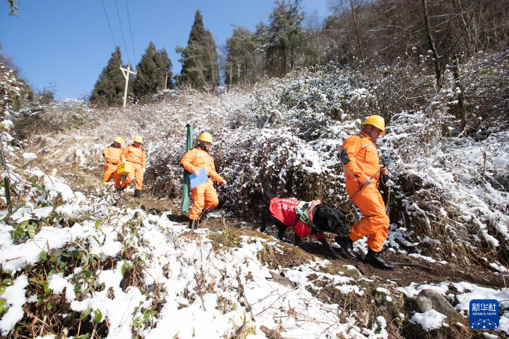 1月22日,电力工作人员在四川省江油市观雾山自然保护区内巡线。