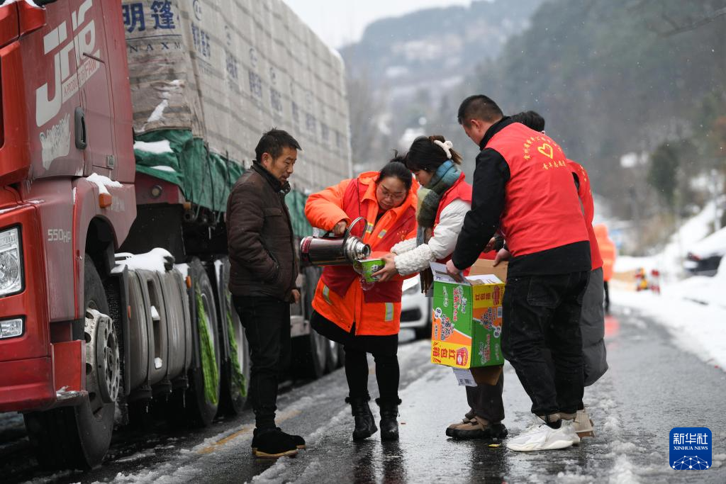 1月22日,贵州省黔东南苗族侗族自治州黄平县243国道,志愿者为滞留的货车司机送开水和泡面。