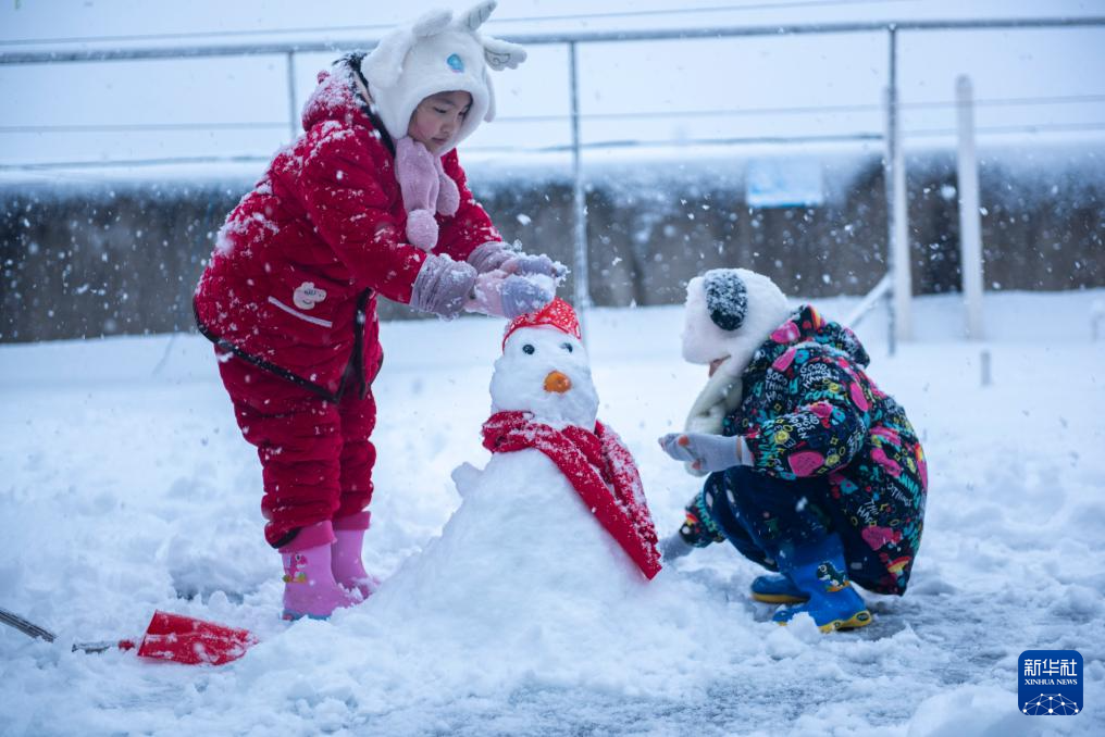 1月22日,湖南省娄底市娄星区一小区内,小朋友在堆雪人。