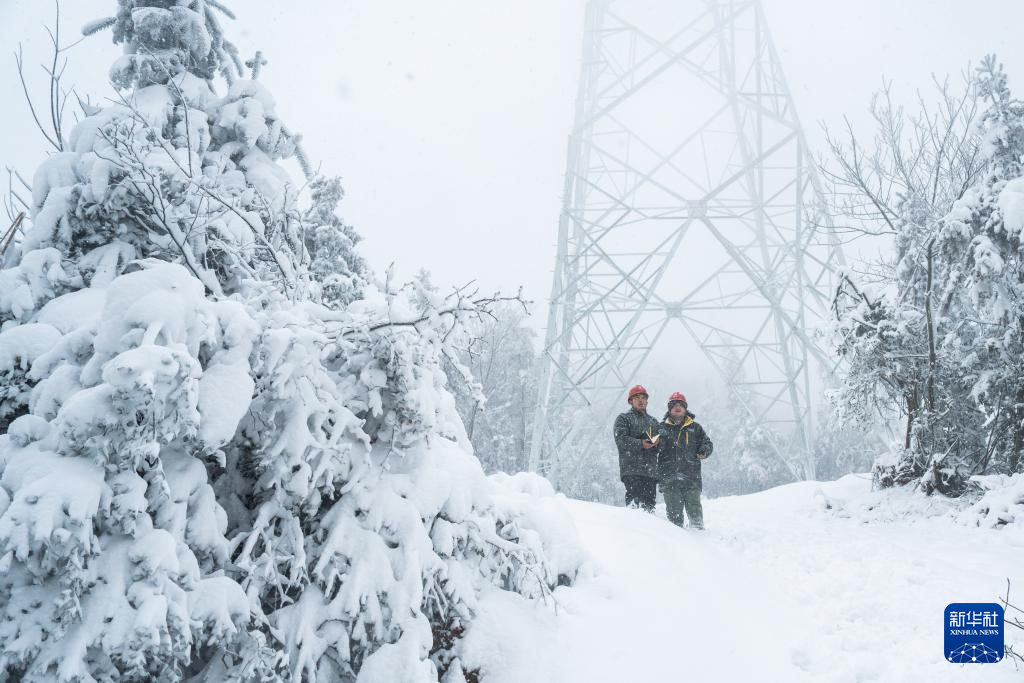 1月22日,在湖南省长沙市浏阳市蕉溪镇蕉溪岭,国网长沙供电公司输电检修人员在巡线途中进行电力设施覆冰情况监测。