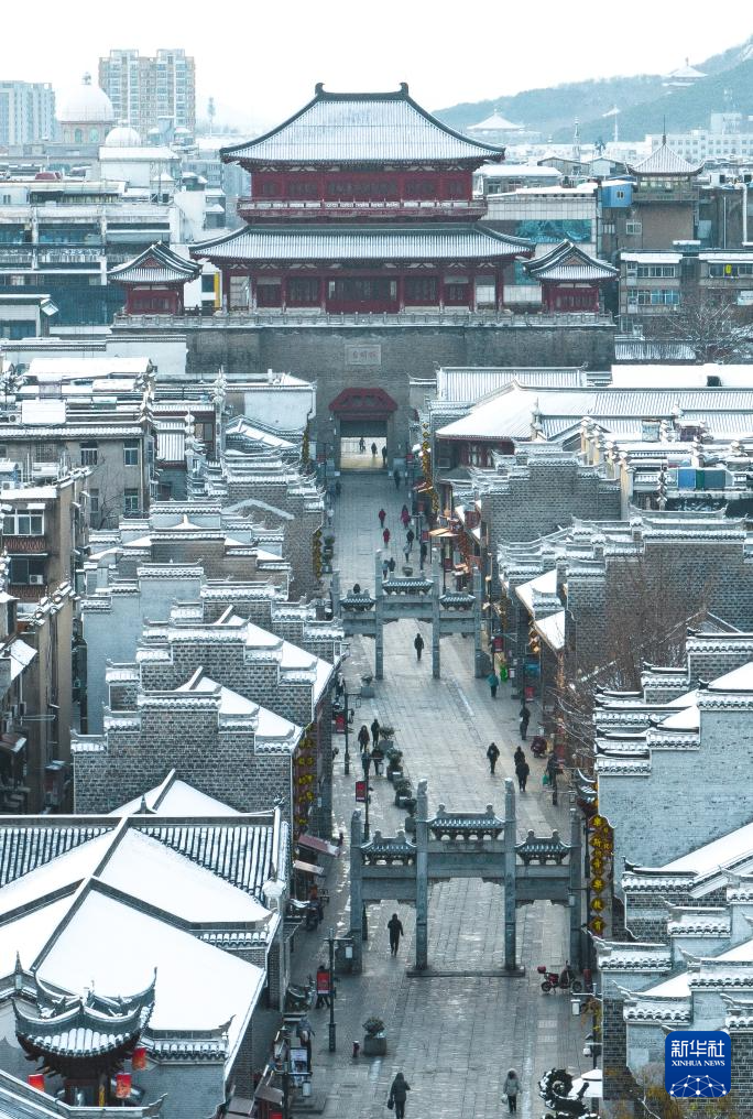 1月22日,游人冒雪在浙江省临海市紫阳古街游玩(无人机照片)。