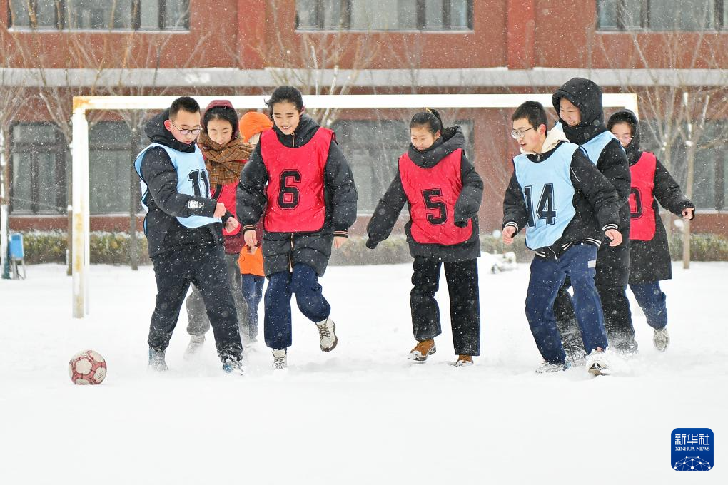 1月22日,山东省烟台市福山区芝阳山学校的学生在进行雪地足球游戏。