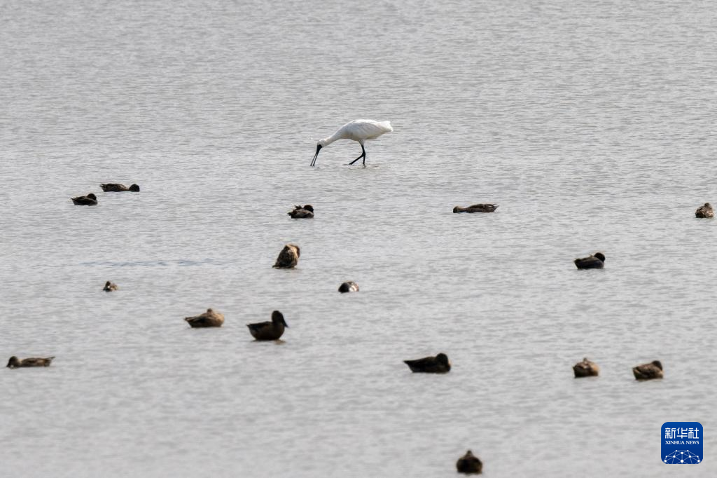 1月11日,一只黑脸琵鹭在米埔自然保护区觅食。
