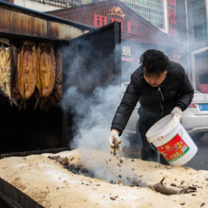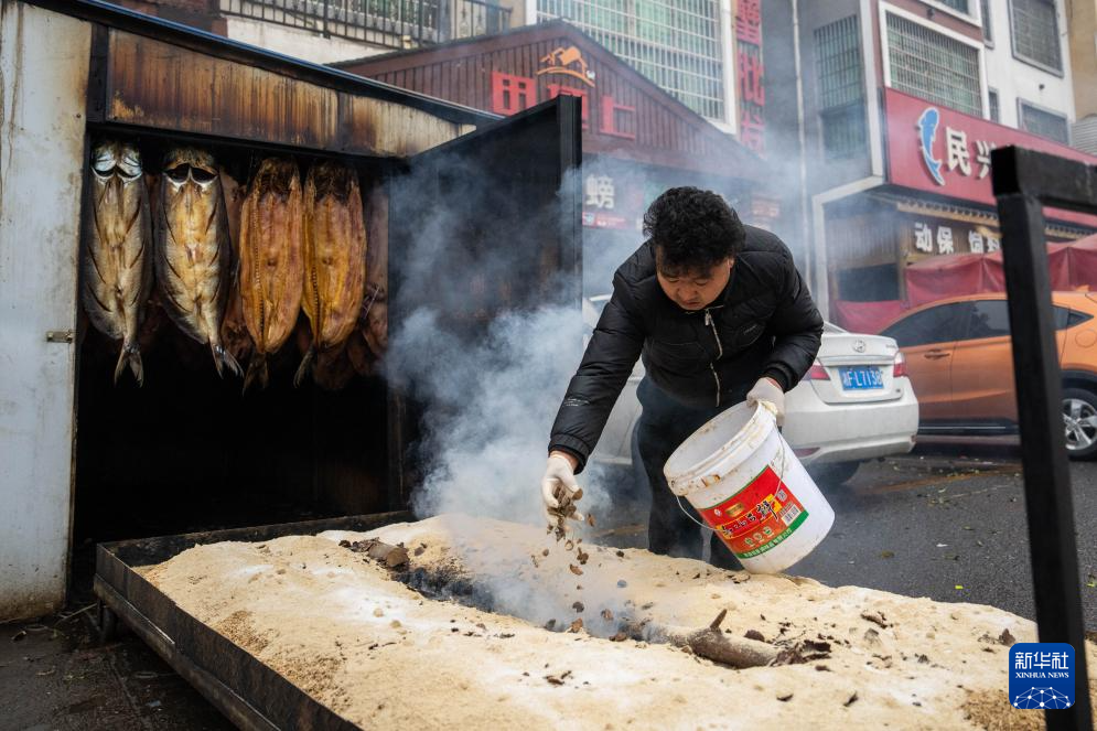 2月2日,在湘阴县鹤龙湖镇一家腊制品店,工作人员熏制腊鱼。