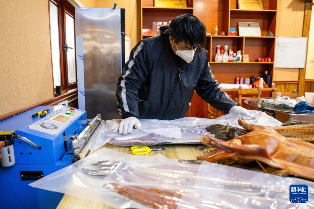 2月2日,在湘阴县鹤龙湖镇一家腊制品店,工作人员取腊鱼。