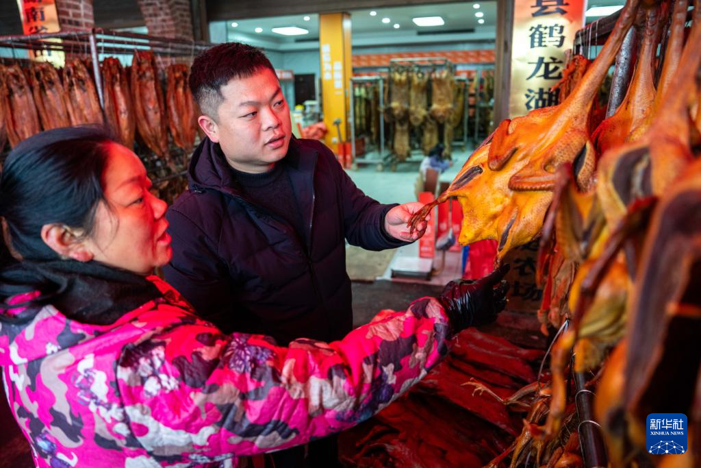 2月2日,在湘阴县鹤龙湖镇一家腊制品店,消费者(右)挑选腊鹅。