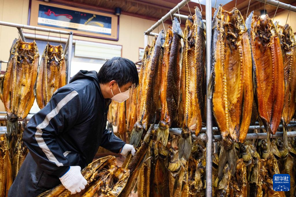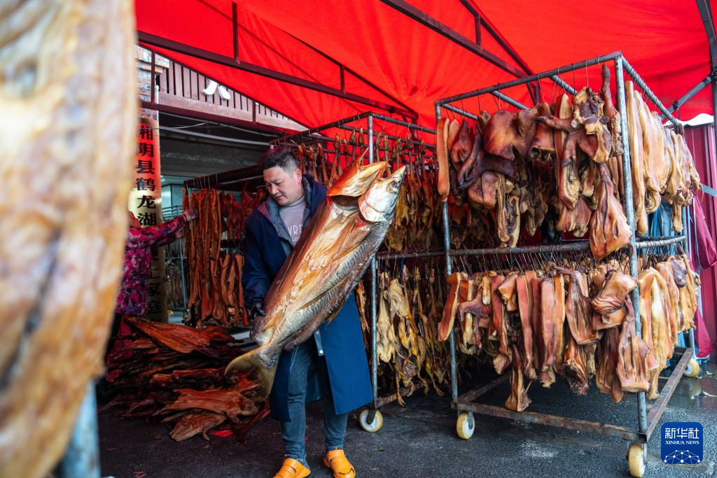 春节临近,湖南省岳阳市湘阴县鹤龙湖镇保合社区腊味一条街上,一串串熏好的腊鱼、腊肉等食品悬挂在室内外,随风散发出浓浓的年味。目前,鹤龙湖镇拥有从事腊味相关商户近千家,产值达两亿元。据了解,鹤龙湖镇是湖南省特色农业小镇,2022年入选全国农业产业强镇创建名单。