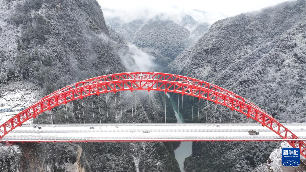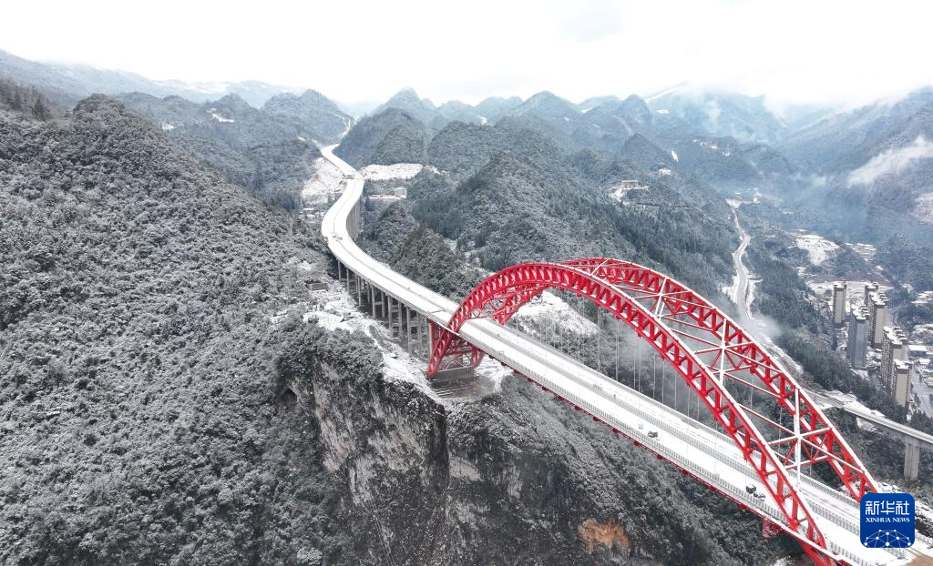 这是2月4日拍摄的位于湖北省鹤峰县的宜来高速公路鹤峰东段溇水河特大桥雪景(无人机照片)。