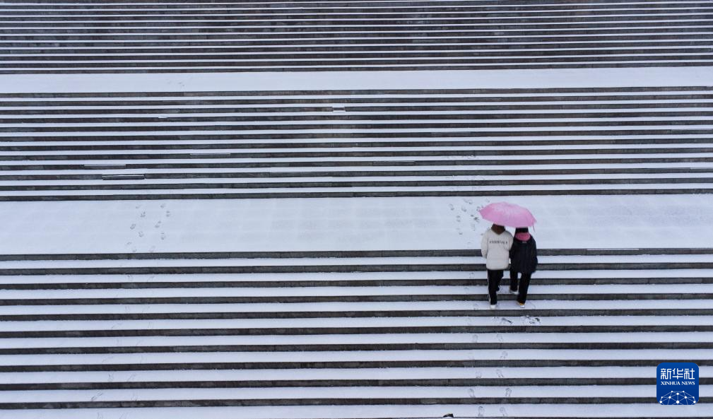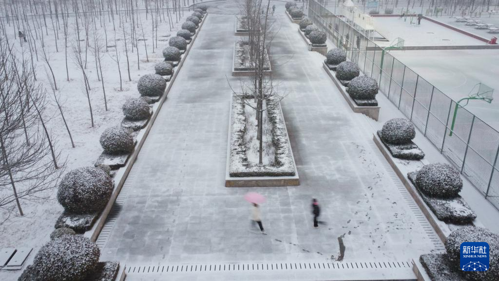2月4日,在山东省枣庄市山亭区文化休闲广场,行人在雪中出行(无人机照片)。