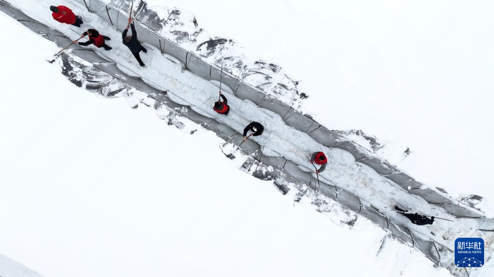 2月4日,在湖南省临湘市羊楼司镇,公路养护人员在进行除冰作业。