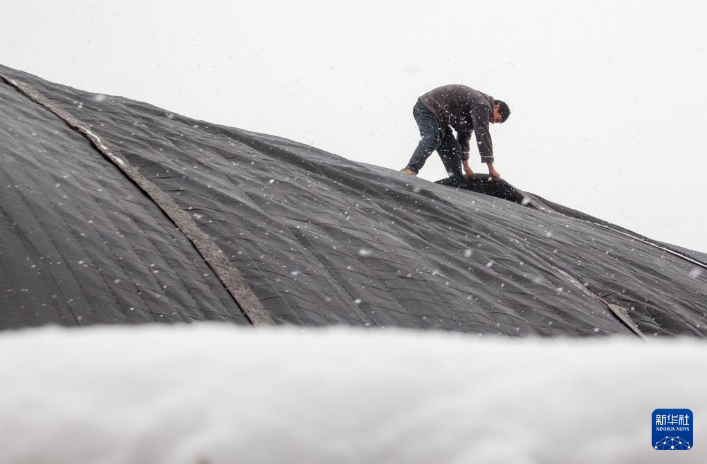 2月4日,在河南省夏邑县会亭镇朱瓦房村,村民冒雪加固育苗大棚。