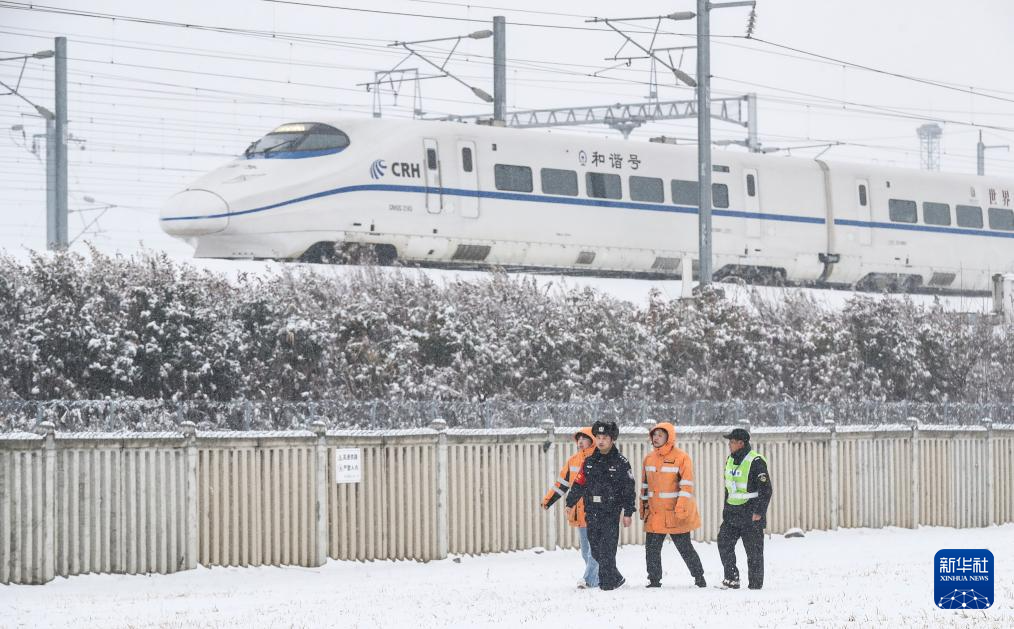 2月4日,铁路公安民警和高铁基础设施线路工在江苏淮安东站线路段巡查。
