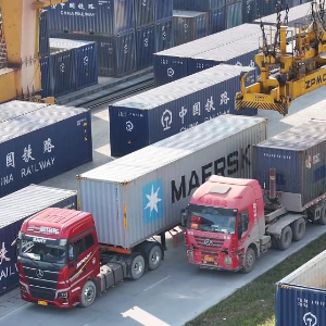 货车在南宁国际铁路港货场中转跨境运输的集装箱(2月2日摄)。