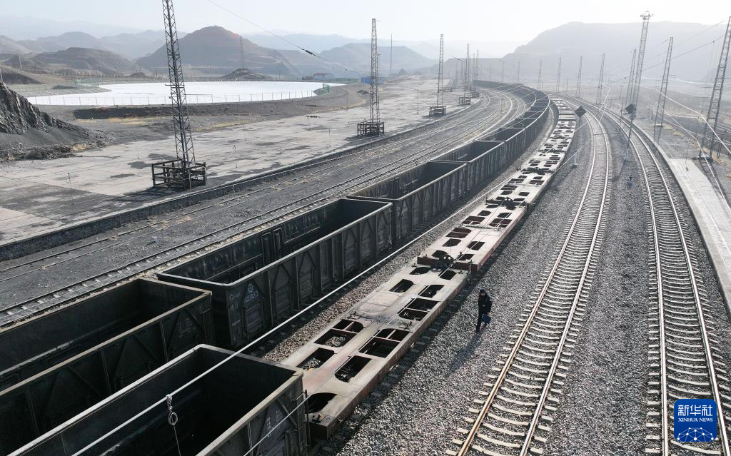 2月9日,王嘉萱在宁夏石嘴山市大磴沟车站对火车车体进行检查(无人机照片)。