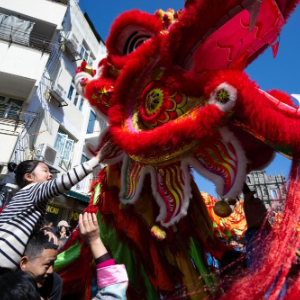 2月11日,澳门旅游局在大三巴牌坊前安排舞龙舞狮贺岁活动,吸引大批市民游客驻足观赏。