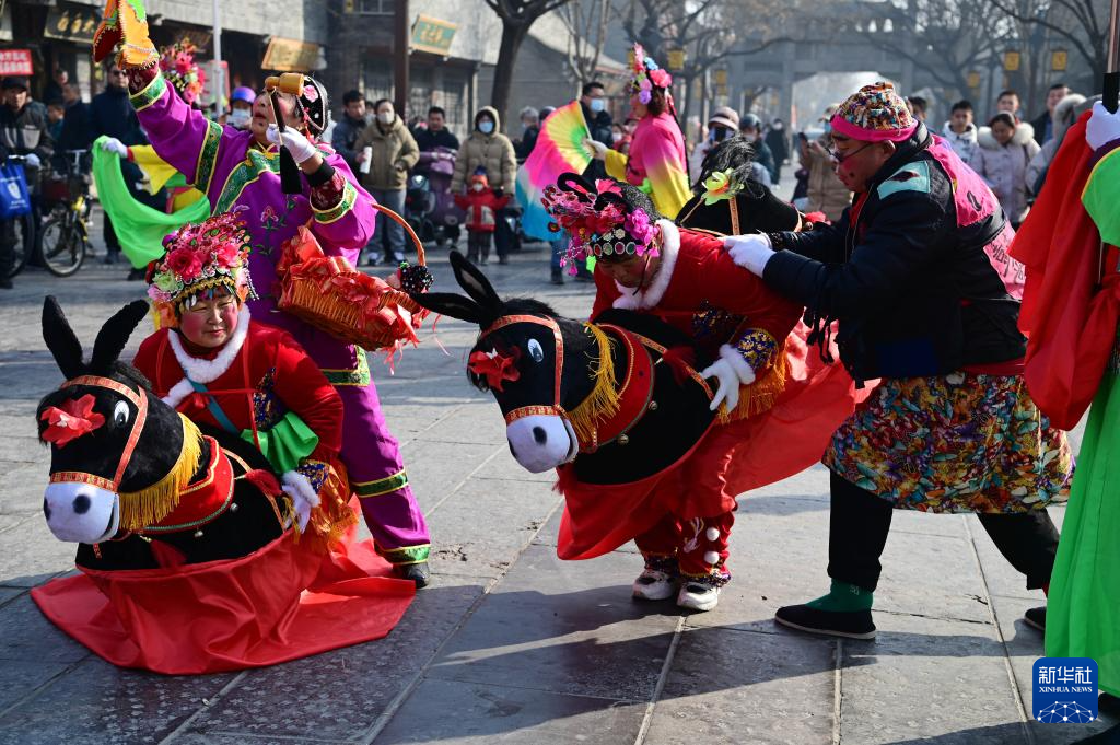2月11日,山东省聊城市东昌府区道口铺街道仙庄村秧歌队在进行民俗表演。