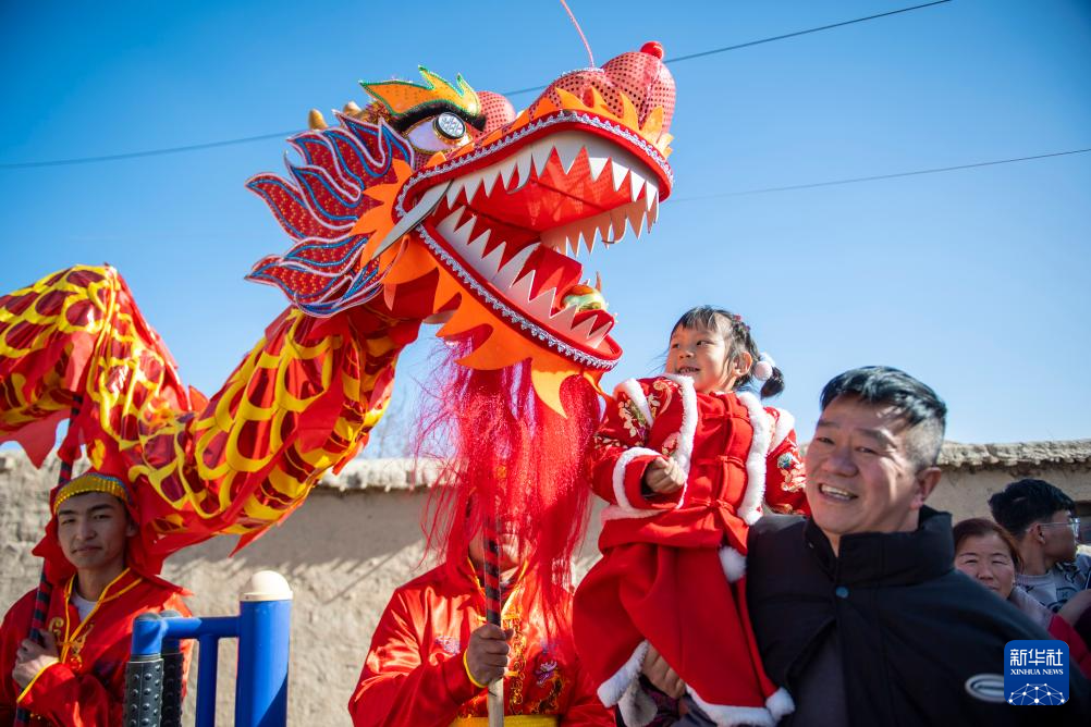 2月11日,甘肃省酒泉市下河清镇紫金村社火队走村串户舞龙耍社火。