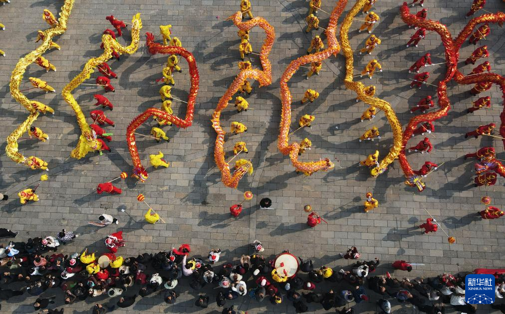 2月11日,民间艺人在江苏省淮安市金湖县尧帝古城表演舞龙(无人机照片)。