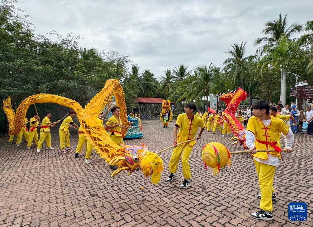 2月11日,演员在海南省三亚市南山文化旅游区表演舞龙。
