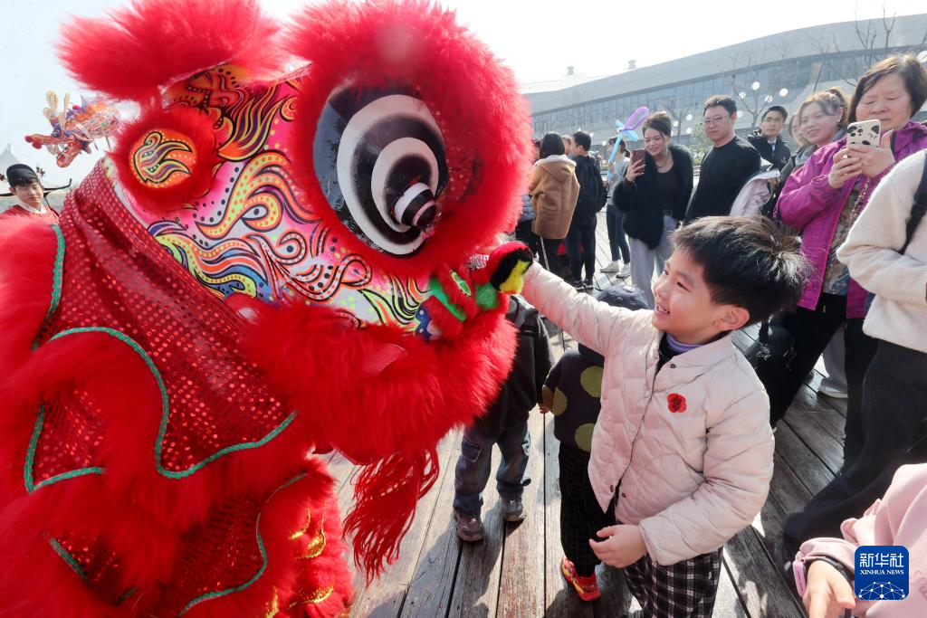 2月11日,在浙江省湖州市德清县,小朋友与舞狮表演队互动。