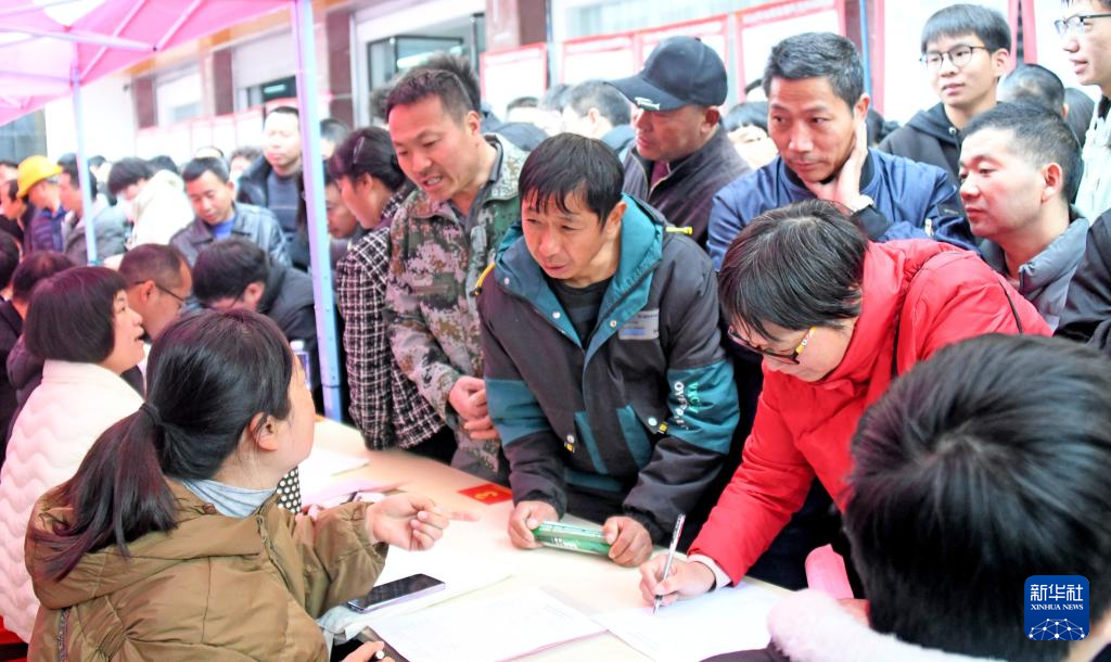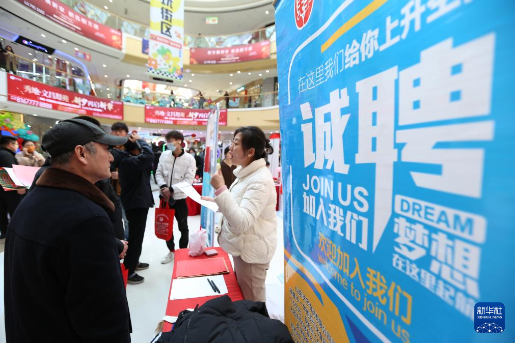2月15日,求职者在山东省滕州市“榴枣归乡”2024年春风行动返乡人员专场招聘会上了解就业信息。