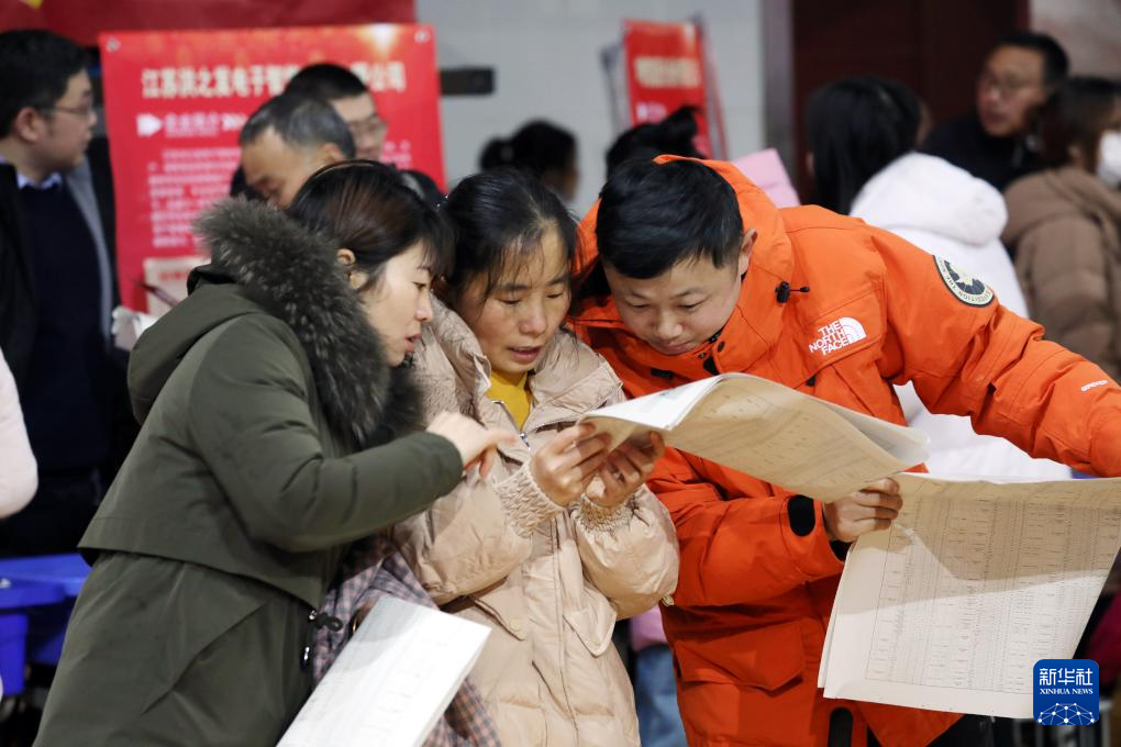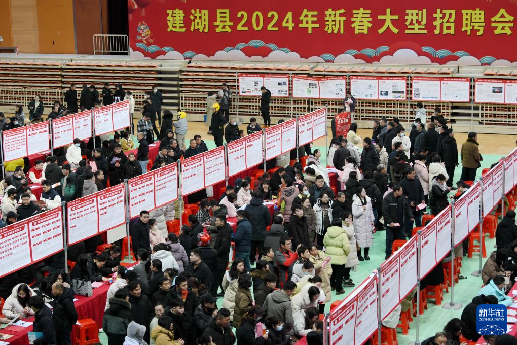 2月15日,求职者在江苏省建湖县2024年新春大型招聘会上了解招聘信息。