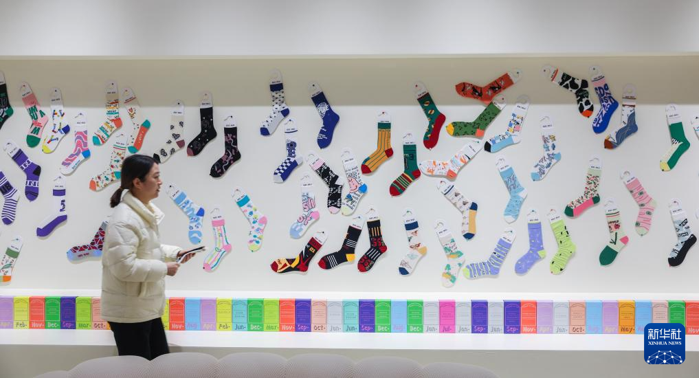 2月24日,一名女子从位于诸暨市的浙江凯诗利科技有限公司袜子样品展示墙前走过。